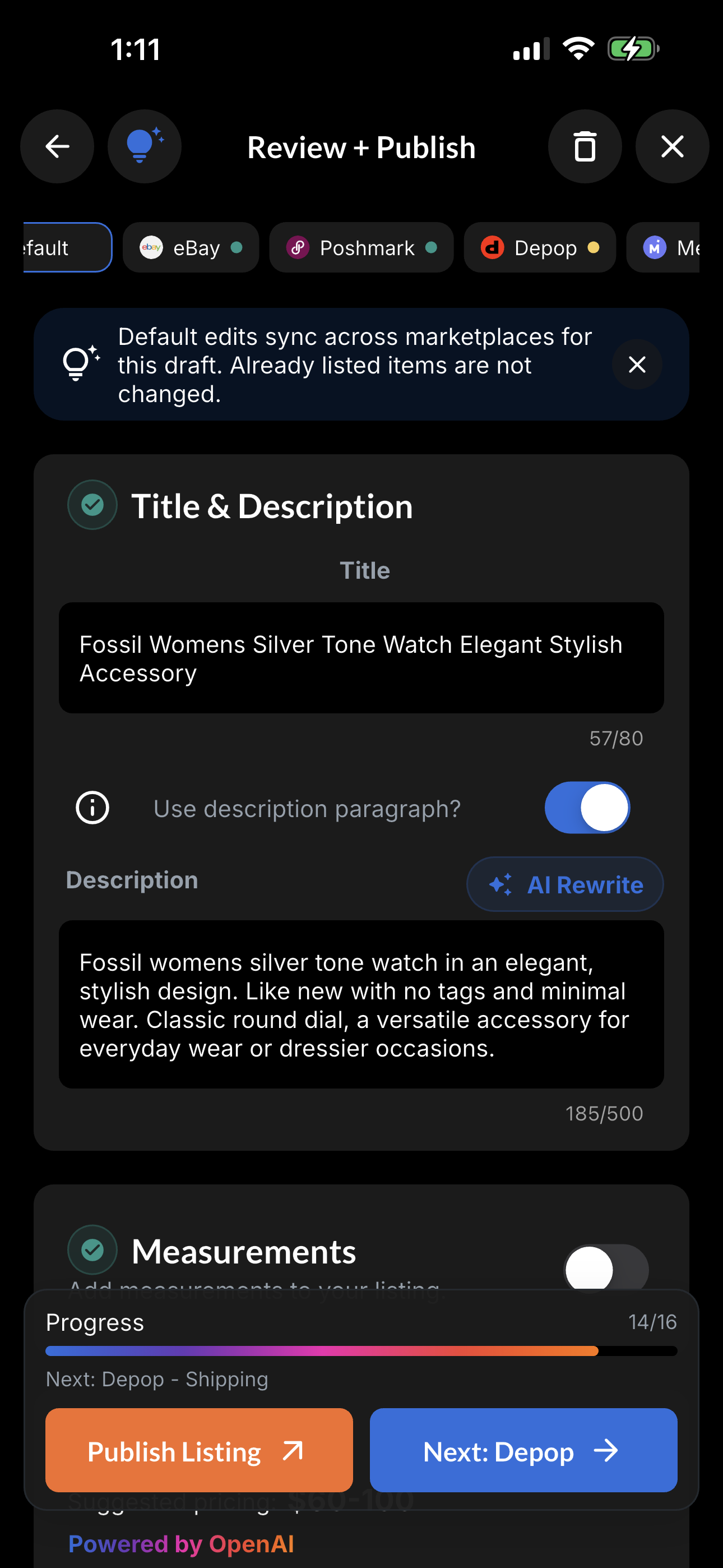 Review once, then publish across eBay, Poshmark, Depop, and Mercari.